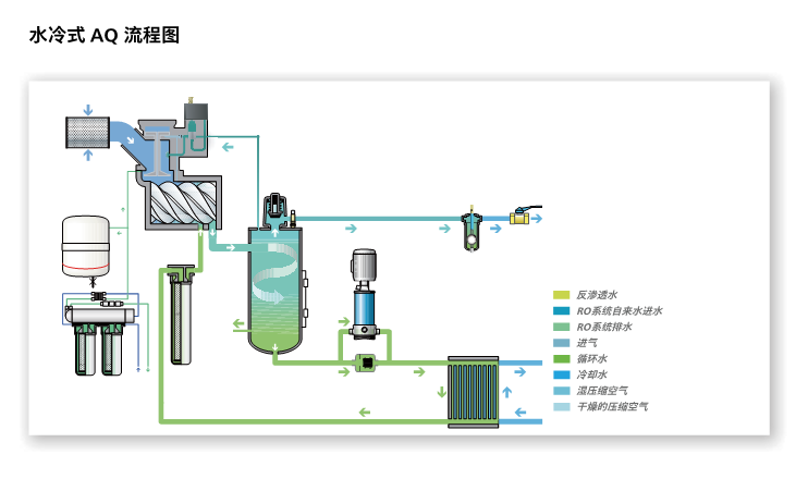 AQ擁有創(chuàng)新的無油技術(shù),噴水螺桿通過ISO8573-1零等級認(rèn)證設(shè)置空氣純度標(biāo)準(zhǔn),AQ提供風(fēng)冷與水冷,現(xiàn)場型和全性能型,由于水的冷卻效果確保熱量有效的去除從而提高了能源效率。